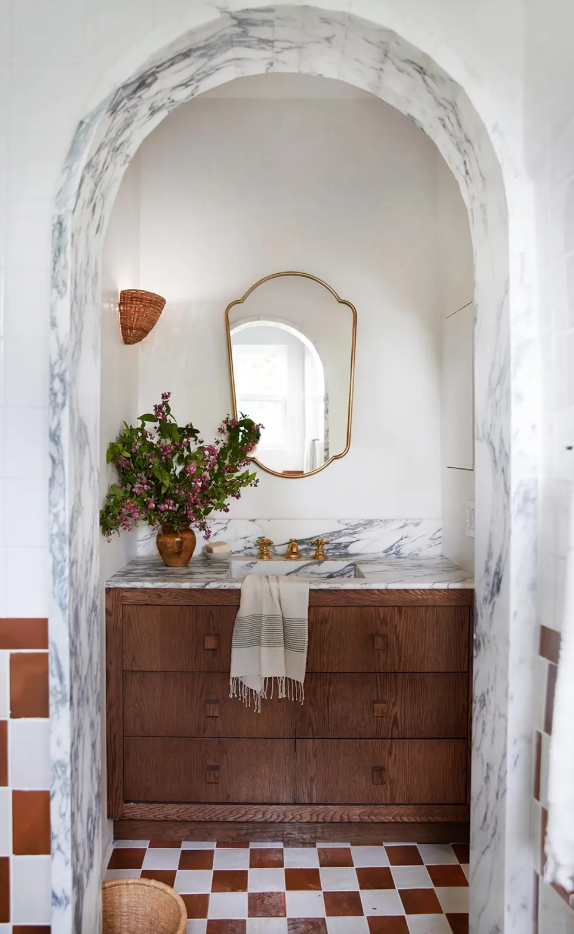 Form is preceded by color. Soft neutrals emphasize the arc without distraction. The arched cabinet is matched with deep greens and warm whites that are in harmony with calmness.