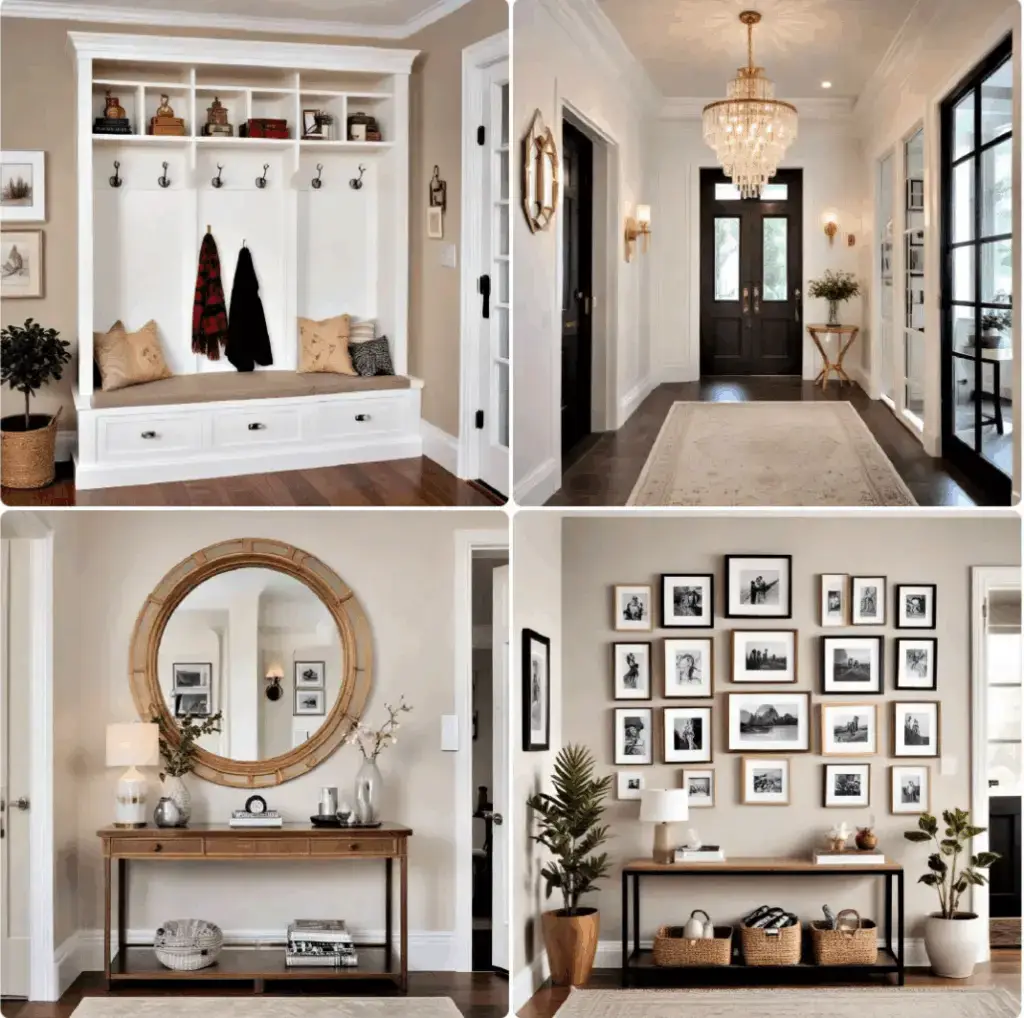 Furniture such as consoles, mirrors, and decorative tables adds interest to the visual and balances functionality. The mix of fashion and functionality will make the entrance a functional and attractive area. The selection of furniture that matches the current decoration enhances unity within the house.